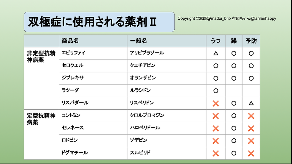 「非定型」抗精神病薬は、薬の種類によってバラバラですが、躁を抑える効果に加え、うつを上げる効果や、躁やうつを予防する効果もあります。